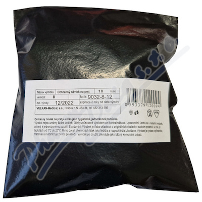 Vyšetřovací lékařský prst, latexový, velikost číslo 8. Balení je po 10 kusech v PE černém sáčku. Výrobce VULKAN-Medical, a.s.
