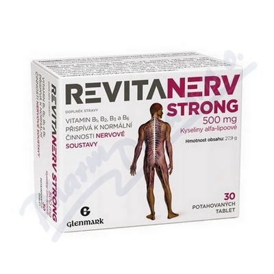 Doplněk stravy Revitanerv 30 kapslí s obsahem kyseliny alfa-lipoové, extraktu z Ginkgo biloby, Niacinu, kyseliny pantothenové, vitaminů E, B1, B6, B2, Niacinu a Selenu přispívá k normální činnosti nervové soustavy.