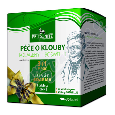 Priessnitz Péče o klouby je doplněk stravy obsahující 3 typy kolagenů a boswellii, která přispívá k podpoře hybnosti a pružnosti kloubů a působí příznivě při zvýšené zátěži kloubů, svalů a kostí.