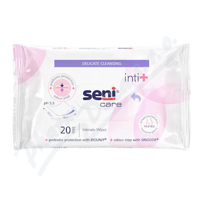 Intimní vlhčené ubrousky Seni Care Inti+ jsou určené k jednoduché a rychlé hygieně intimních míst i při inkontinenci. Obsah SINODOR neutralizuje nepříjemný zápach, komplex BIOLIN/P chrání přirozenou mikroflóru. Balení obsahuje 20 kusů.