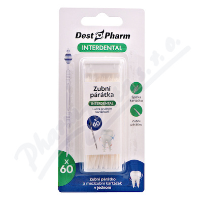 Zubní párátka s mezizubním kartáčkem DESTPHARM důkladně odstraňují zbytky potravy. Párátka jsou vyrobena z naprosto hygienického, měkkého ohebného plastu. Balení obsahuje 60 ks a je vhodné do domácností, kanceláří, aut i jako kapesní balení.
