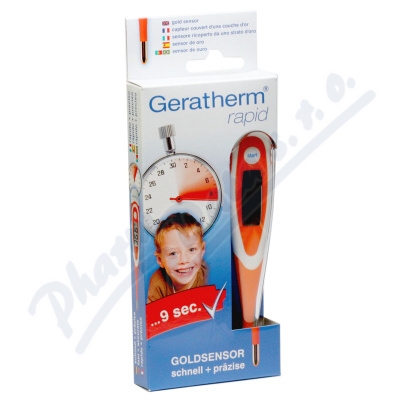 Teploměr Rapid Geratherm je digitální rychloběžka s ohebným koncem, určená k měření v ústech nebo konečníku do 10 vteřin, rychlé a přesné měření.