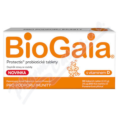 Pomáhá obnovit a udržovat rovnováhu střevní mikrobioty. Vitamin D podporuje správnou funkci imunitního systému. Pomerančová příchuť. Jedna tableta obsahuje 100 milionu živých bakterií L. reuteri Protectis a 20 mcg (800 IU) vitaminu D3.