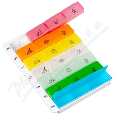 Slouží k přehlednému a spolehlivému dávkování léků doma i na cestách. Každý den má 3 přihrádky, které lze použít např. k dávkování ráno, v poledne a večer. Obsahuje jednoduché ikony značící denní dobu a znakové odlišení pro zdravotně postižené.