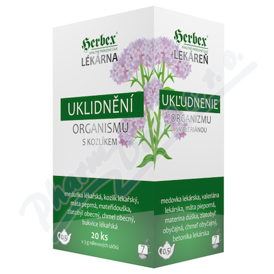 Herbex Uklidnění organismu je porcovaný čaj. Kozlík přispívá k duševní pohodě v případě napětí a stresu. Meduňka přispívá kvalitnějšímu spánku, pomáhá snížit napjatost a podrážděnost. Máta přispívá k optimální relaxaci.