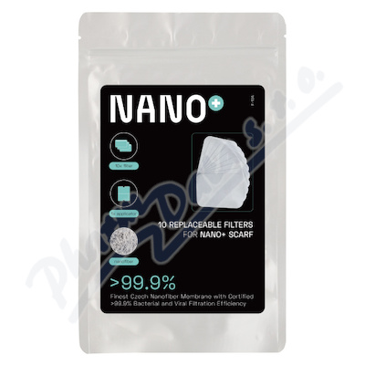 Sada náhradních filtrů s membránou z českého nanovlákna do funkčního nákrčníku NANO+. Membrána slouží jako mechanická bariéra před viry, bakteriemi, alergeny, smogem nebo před nebezpečnými částicemi v ovzduší.