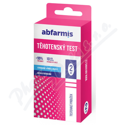 Abfarmis Těhotenský test ve formě testovacích proužků. Disponuje vysokou citlivostí 10 mIU/ml s více než 99% přesností výsledku testování. Nabízí jednoduché a rychlé použití.
