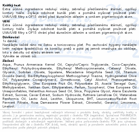 Extra účinné ingredience redukují vrásky, zabraňují předčasnému stárnutí, vyplňují kontury tváře. Zvyšuje odolnost buněk pleti a pomáhá zvyšovat pružnost pleti. UVA/UVB filtry s OF15 chrání před slunečním zářením a vznikem pigmentových skvrn.