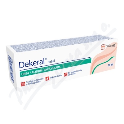 Dekeral® mast obsahuje kombinaci dvou látek, urey (20%) a kyseliny salicylové v ambifilním, vodou smývatelném masťovém základu. Je vhodná k ošetření nadměrně zrohovatělé ztvrdlé pokožky.Pomáhá odstranit hyperkeratotická ložiska a šupiny.