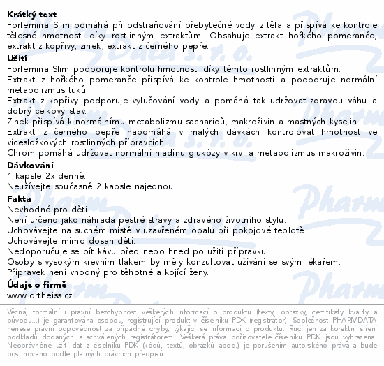 Forfemina Slim pomáhá při odstraňování přebytečné vody z těla a přispívá ke kontrole tělesné hmotnosti díky rostlinným extraktům. Obsahuje extrakt hořkého pomeranče, extrakt z kopřivy, zinek, extrakt z černého pepře.