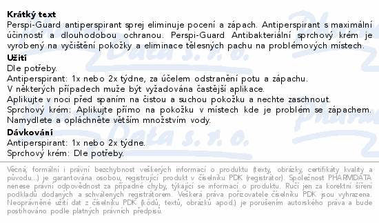 Perspi-Guard antiperspirant sprej eliminuje pocení a zápach. Antiperspirant s maximální účinností a dlouhodobou ochranou. Perspi-Guard Antibakteriální sprchový krém je vyrobený na vyčištění pokožky a eliminace tělesných pachu na problémových místech.