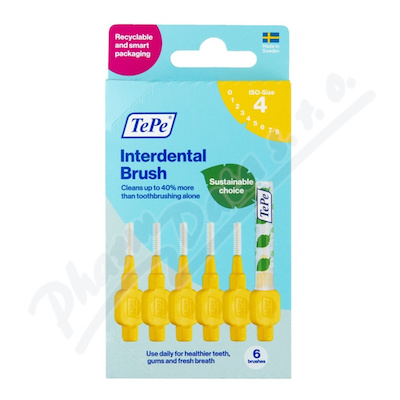 TePe Original meziz. kartáčky 0,7 mm, žluté, 6 ks. Drátek je potažený plastem pro maximální ochranu dásní a citlivých zubních krčků. Vysoce odolné vůči zlomení. Plochá rukojeť pro pohodlné a přesné čištění. Baleno v papírové uzavíratelné krabičce.