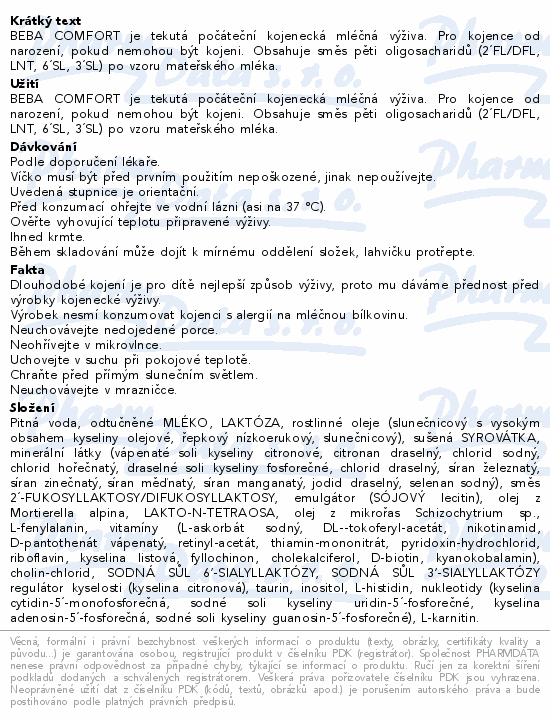 BEBA COMFORT je tekutá počáteční kojenecká mléčná výživa. Pro kojence od narození, pokud nemohou být kojeni. Obsahuje směs pěti oligosacharidů (2´FL/DFL, LNT, 6´SL, 3´SL) po vzoru mateřského mléka.
