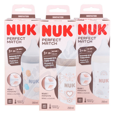 Kojenecká láhev NUK Perfect Match, s měkkou silikonovou savičkou a velikostí "M" od 3 měsíců (pro kojenecké mléko), 260 ml, neobsahuje BPA, antikolikový systém, s kontrolou teploty. Mix barev v kartonu.