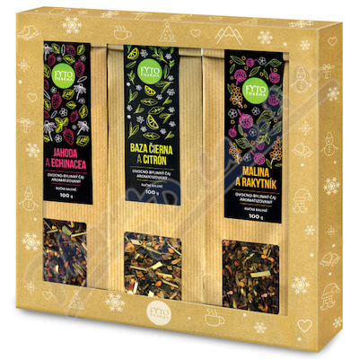 Kazeta sypaných, ovocno-bylinných aromatizovaných čajů Jahoda a echinacea, Černý bez a citron, Malina a rakytník. Hmotnost 300g (3 sáčky po 100g)