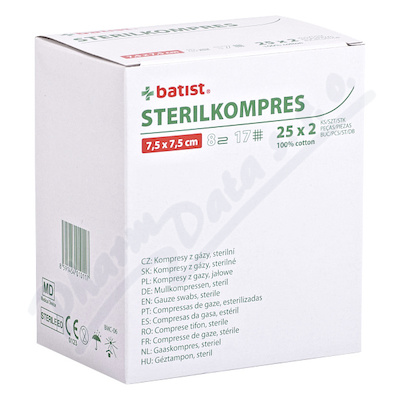 Kompresy z gázy sterilní jsou vyrobeny ze 100% bavlněných, bělených vláken, tkaných v počtu 17 vláken na cm2, jsou osmivrstvé. Dobrá savá schopnost, prodyšnost.