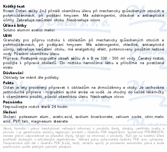 Rosen Octan sáčky 2+2 přináší okamžitou úlevu při mechanicky způsobených otocích a pohmožděninách, při pošítání hmyzem. Má adstringentní, chladivé a antiseptické účinky. Zabraňuje narůstání otoku. Neobsahuje olovo.